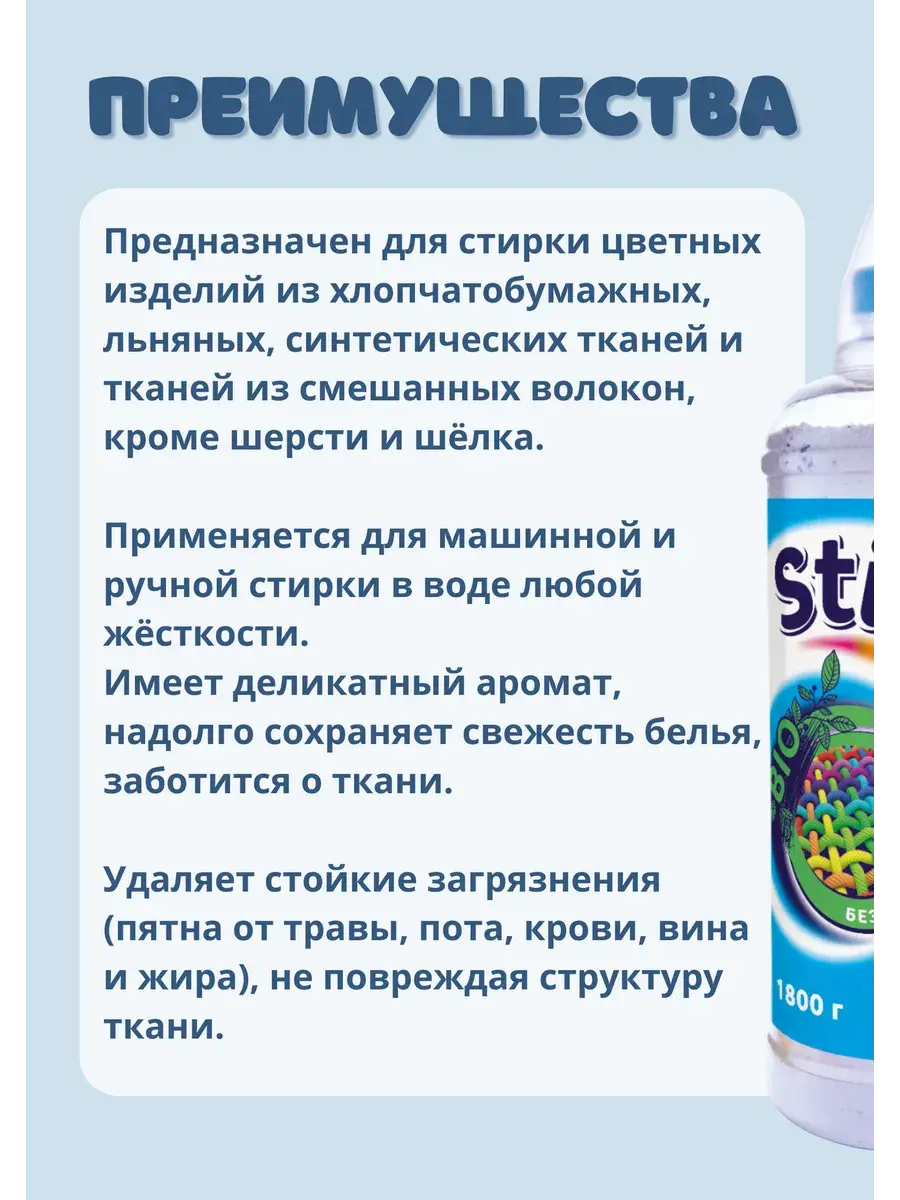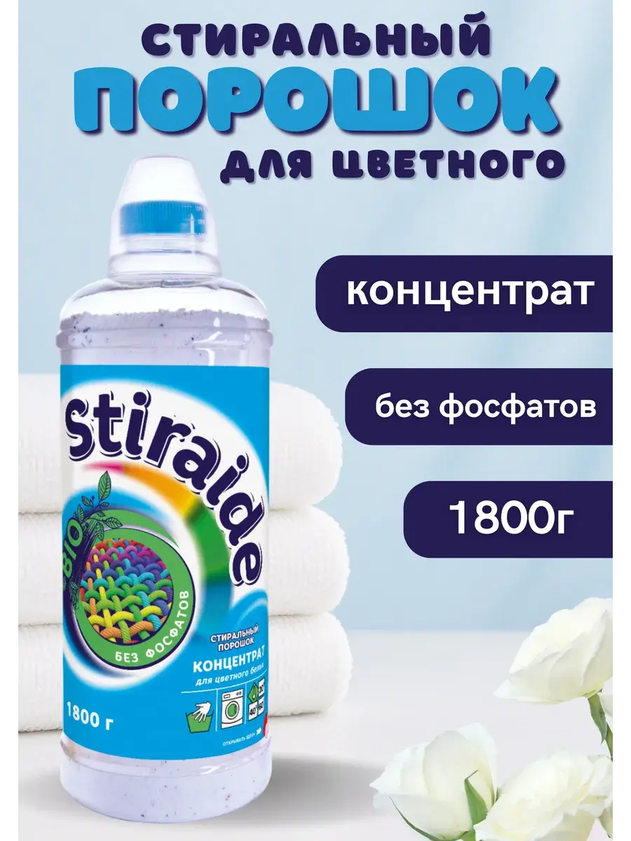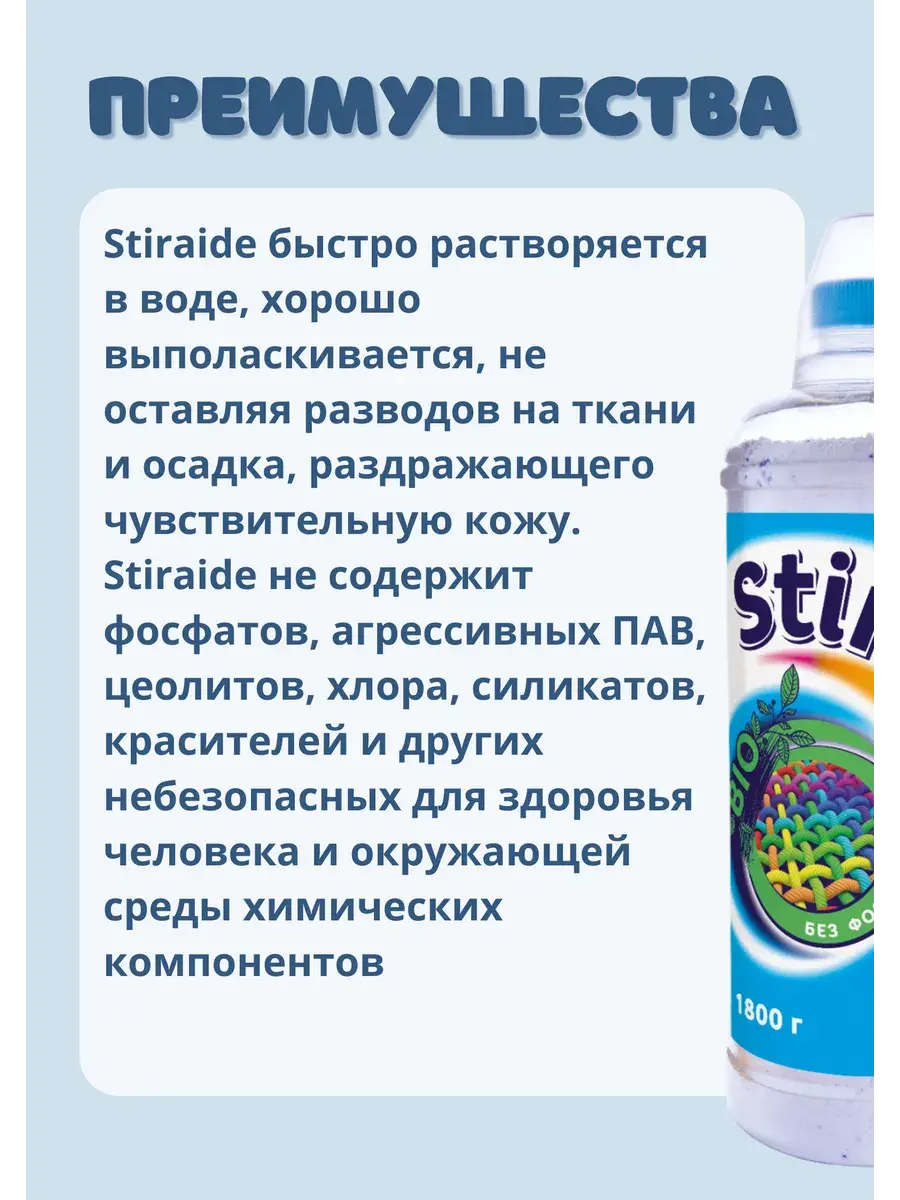 Стиральный порошок Stiraide-концентрат для цветного белья применяется для машинной и ручной стирки в воде любой жёсткости. Имеет деликатный аромат, надолго сохраняет свежесть белья, заботится о ткани. Благодаря наличию биологически активных веществ (энзимов) удаляет стойкие загрязнения (пятна от травы, пота, крови, вина и жира), не повреждая структуру ткани. «Stiraide» быстро растворяется в воде, хорошо выполаскивается, не оставляя разводов на ткани и осадка, раздражающего чувствительную кожу. Концентрированная формула гарантирует высокую эффективность и экономичное расходование. Средства для удаления накипи, входящие в состав стирального порошка, делают воду мягкой, обеспечивая защиту и долгую службу стиральной машины. «Stiraide» не содержит фосфатов, агрессивных ПАВ, цеолитов, хлора, силикатов, красителей и других небезопасных для здоровья человека и окружающей среды химических компонентов. Предназначен для стирки цветных изделий из хлопчатобумажных, льняных, синтетических тканей и тканей из смешанных волокон, кроме шерсти и шёлка.