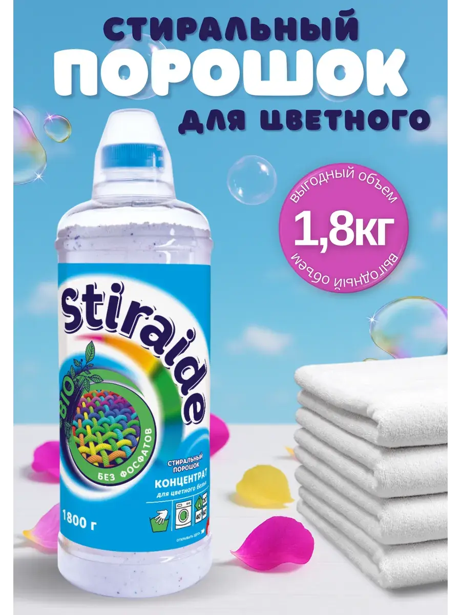Стиральный порошок Stiraide-концентрат для цветного белья применяется для машинной и ручной стирки в воде любой жёсткости. Имеет деликатный аромат, надолго сохраняет свежесть белья, заботится о ткани. Благодаря наличию биологически активных веществ (энзимов) удаляет стойкие загрязнения (пятна от травы, пота, крови, вина и жира), не повреждая структуру ткани. «Stiraide» быстро растворяется в воде, хорошо выполаскивается, не оставляя разводов на ткани и осадка, раздражающего чувствительную кожу. Концентрированная формула гарантирует высокую эффективность и экономичное расходование. Средства для удаления накипи, входящие в состав стирального порошка, делают воду мягкой, обеспечивая защиту и долгую службу стиральной машины. «Stiraide» не содержит фосфатов, агрессивных ПАВ, цеолитов, хлора, силикатов, красителей и других небезопасных для здоровья человека и окружающей среды химических компонентов. Предназначен для стирки цветных изделий из хлопчатобумажных, льняных, синтетических тканей и тканей из смешанных волокон, кроме шерсти и шёлка.