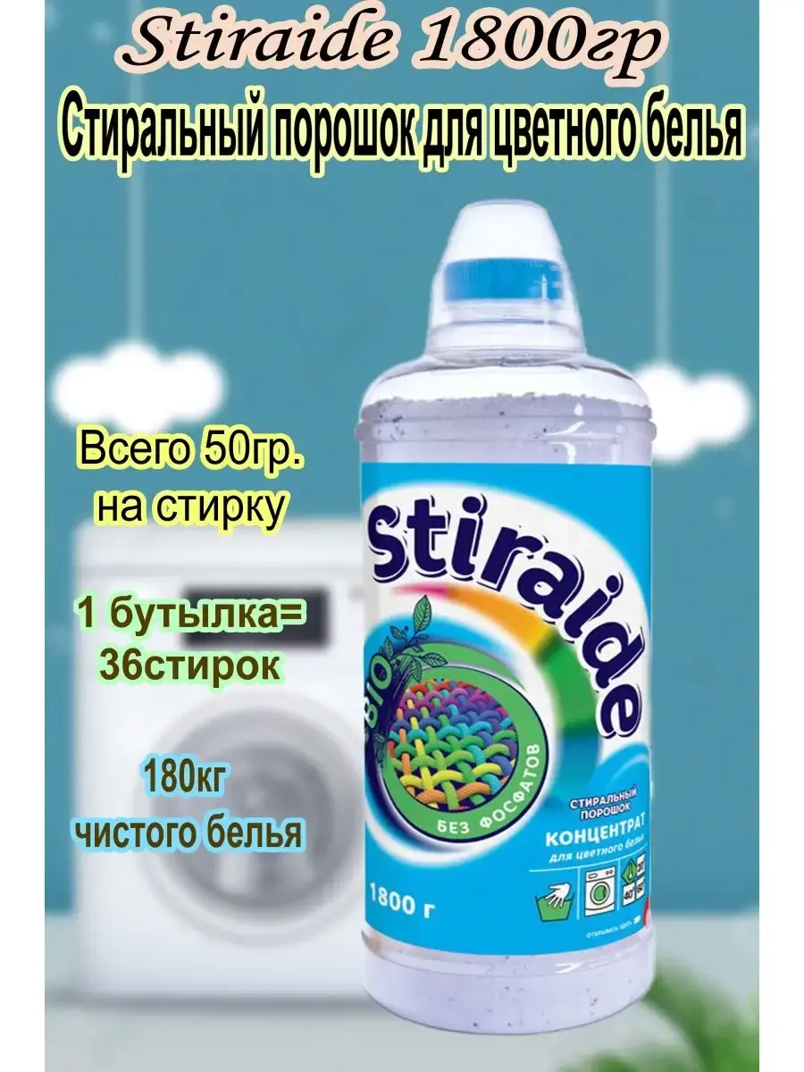 Стиральный порошок Stiraide-концентрат для цветного белья применяется для машинной и ручной стирки в воде любой жёсткости. Имеет деликатный аромат, надолго сохраняет свежесть белья, заботится о ткани. Благодаря наличию биологически активных веществ (энзимов) удаляет стойкие загрязнения (пятна от травы, пота, крови, вина и жира), не повреждая структуру ткани. «Stiraide» быстро растворяется в воде, хорошо выполаскивается, не оставляя разводов на ткани и осадка, раздражающего чувствительную кожу. Концентрированная формула гарантирует высокую эффективность и экономичное расходование. Средства для удаления накипи, входящие в состав стирального порошка, делают воду мягкой, обеспечивая защиту и долгую службу стиральной машины. «Stiraide» не содержит фосфатов, агрессивных ПАВ, цеолитов, хлора, силикатов, красителей и других небезопасных для здоровья человека и окружающей среды химических компонентов. Предназначен для стирки цветных изделий из хлопчатобумажных, льняных, синтетических тканей и тканей из смешанных волокон, кроме шерсти и шёлка.
