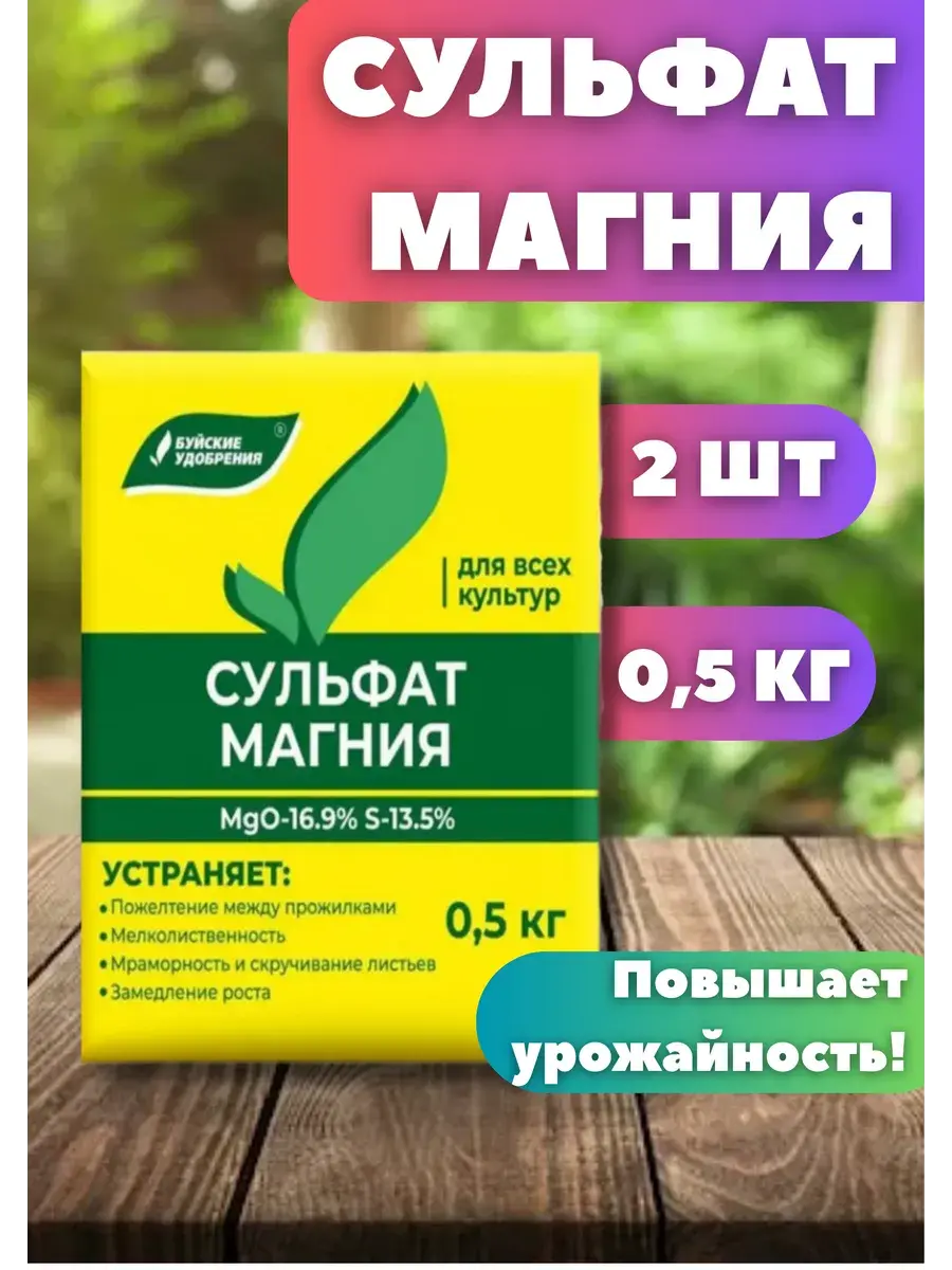 Сульфат магния — это водорастворимое комплексное минеральное удобрение, которое содержит серу и магний. Оно предназначено для предотвращения недостатка магния у растений (хлороза) и усиления фотосинтетической активности листьев. Минеральное удобрение подходит для жидких корневых и некорневых подкормок культур в открытом и защищённом грунте, а также для основного внесения весной при перекопке почвы. Назначение сульфата магния: предотвращение хлороза, вызванного недостатком магния. Усиление фотосинтеза и улучшение зелёной массы растений. Повышение урожайности и качества плодов. Удобрение входит в систему питания для томатов, огурцов и капусты. Доза применения: корневая подкормка: 15–20 г на 10 л воды, проводить 4–5 раз в течение вегетационного периода с интервалом 15–20 дней. Расход рабочего раствора составляет 10 л на 5 м². Некорневая подкормка: 5–20 г на литр воды для уменьшения стрессового воздействия на растение в результате недостатка минерального питания, освещения, перепада температур или обработки химическими средствами защиты. Расход рабочего раствора — 1–1,5 л на 10 м² или до полного смачивания поверхности листьев. Листовые подкормки следует проводить в сухую пасмурную погоду, рано утром или вечером. Одна столовая ложка вмещает 15 г удобрения. Использование сульфата магния помогает обеспечить растения необходимыми питательными веществами, что способствует их здоровому росту и развитию. Это особенно важно для таких культур, как томаты, огурцы и капуста, которые требуют повышенного содержания магния и серы в почве.