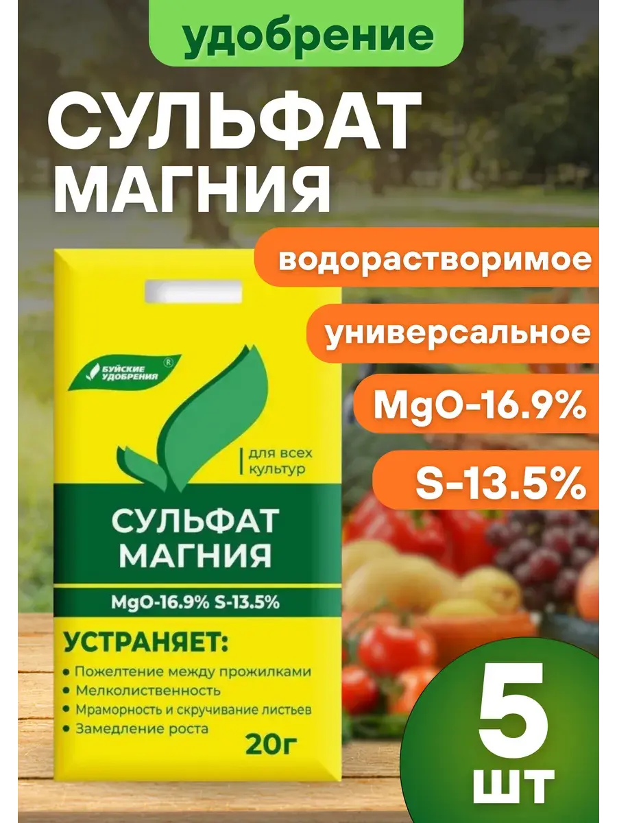 Сульфат магния — это водорастворимое комплексное минеральное удобрение, которое содержит серу и магний. Оно предназначено для предотвращения недостатка магния у растений (хлороза) и усиления фотосинтетической активности листьев. Минеральное удобрение подходит для жидких корневых и некорневых подкормок культур в открытом и защищённом грунте, а также для основного внесения весной при перекопке почвы. Назначение сульфата магния: предотвращение хлороза, вызванного недостатком магния. Усиление фотосинтеза и улучшение зелёной массы растений. Повышение урожайности и качества плодов. Удобрение входит в систему питания для томатов, огурцов и капусты. Доза применения: корневая подкормка: 15–20 г на 10 л воды, проводить 4–5 раз в течение вегетационного периода с интервалом 15–20 дней. Расход рабочего раствора составляет 10 л на 5 м². Некорневая подкормка: 5–20 г на литр воды для уменьшения стрессового воздействия на растение в результате недостатка минерального питания, освещения, перепада температур или обработки химическими средствами защиты. Расход рабочего раствора — 1–1,5 л на 10 м² или до полного смачивания поверхности листьев. Листовые подкормки следует проводить в сухую пасмурную погоду, рано утром или вечером. Одна столовая ложка вмещает 15 г удобрения. Использование сульфата магния помогает обеспечить растения необходимыми питательными веществами, что способствует их здоровому росту и развитию. Это особенно важно для таких культур, как томаты, огурцы и капуста, которые требуют повышенного содержания магния и серы в почве.