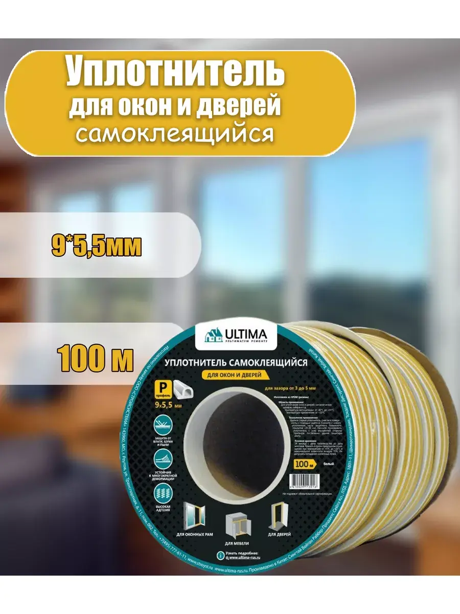 Уплотнитель P-профиль ULTIMA (белый, самокл.) 9*5,5 мм 100 м. Профессиональный уплотнитель Ultima изготовлен из резины EPDM с акриловым клеящим слоем. Благодаря своей мягкости и способности восстанавливаться после сжатия, он обеспечивает надежное уплотнение. Утеплитель легко нарезается на нужные размеры и применяется для заполнения зазоров и швов с целью предотвращения проникновения холодного воздуха, пыли, влаги и шума.