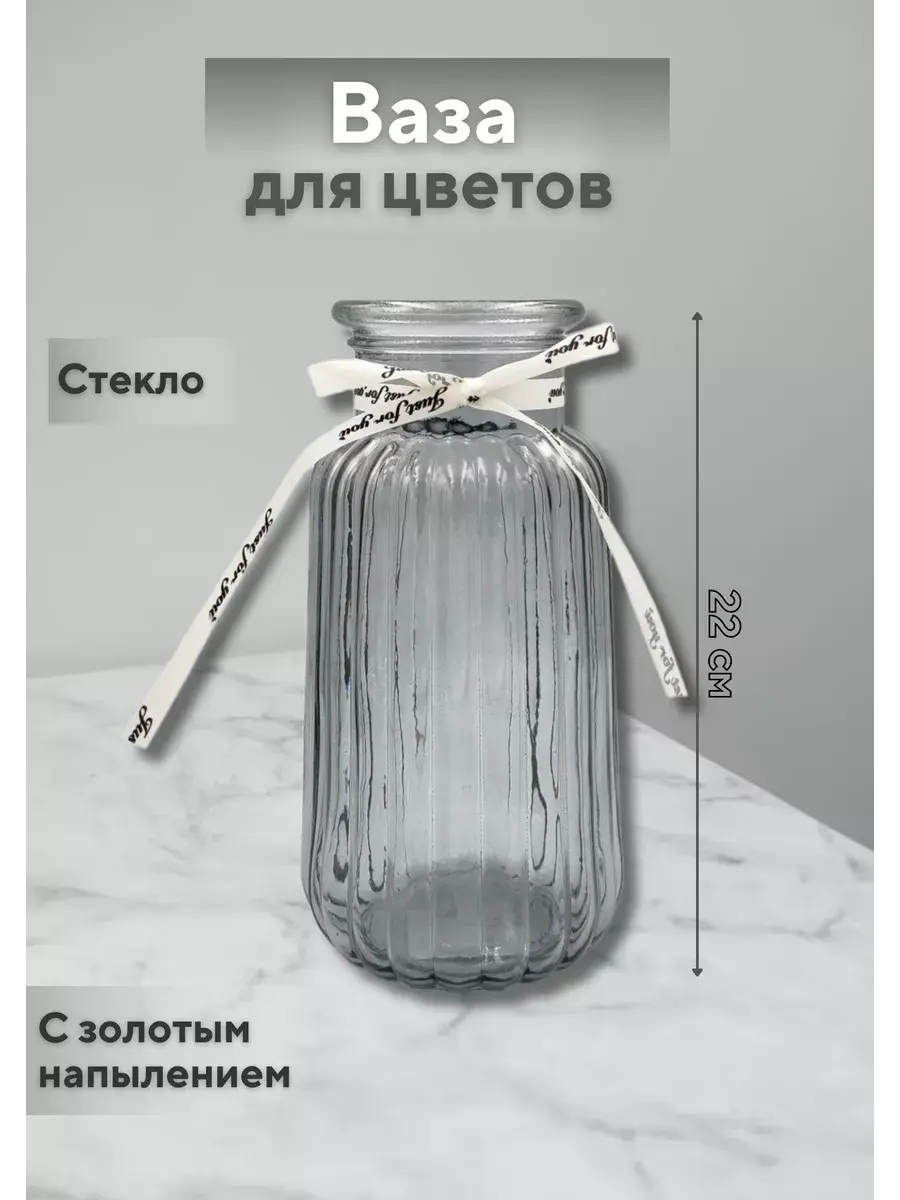 Ваза для цветов серого цвета с золотым напылением, размеры 22 см в высоту и 8,5 см в диаметре. Изготовлена из стекла, имеет устойчивое основание и удобную форму для размещения цветов. Идеально подходит для украшения интерьера, может использоваться в качестве самостоятельного элемента декора или как часть композиции. Отличный выбор для подарка на любой праздник.