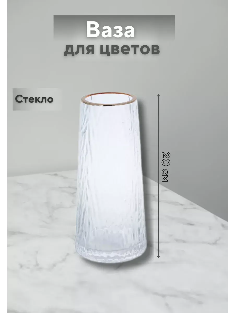Ваза для цветов из стекла с золотым краем, размеры 20 см в высоту и 7,7 см в диаметре. Подходит для украшения интерьера и сервировки стола, может использоваться как для свежих, так и для искусственных цветов. Прекрасный выбор для подарка на любой праздник.
