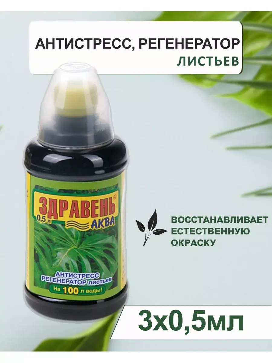 Жидкое комплексное органоминеральное удобрение для внекорневых подкормок всех культур при пожелтении листьев Здравень Аква антистресс. Преимущества: содержит оптимальный набор макро и микроэлементов, не содержит хлора, помогает растениям преодолеть последствия неблагоприятных факторов (перепадов температуры, влажности, освещённости, нападения вредителей, перевозки, пересадки, ошибок в агротехнике и уходе), предотвращает пожелтение листьев (хлороз), восстанавливает естественную окраску, удобно в применении, легко и точно дозируется, экономично. Способ применения: внекорневые подкормки путём опрыскивания листьев 1 раз в неделю или по необходимости из расхода 5,0 мл на 1 л воды.