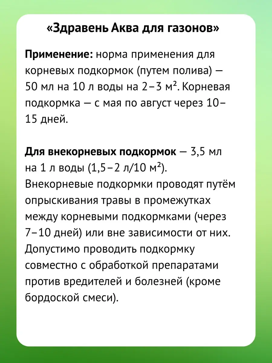 «Здравень аква» для газонов — жидкое комплексное органоминеральное удобрение для подкормки газонов в личных подсобных хозяйствах.