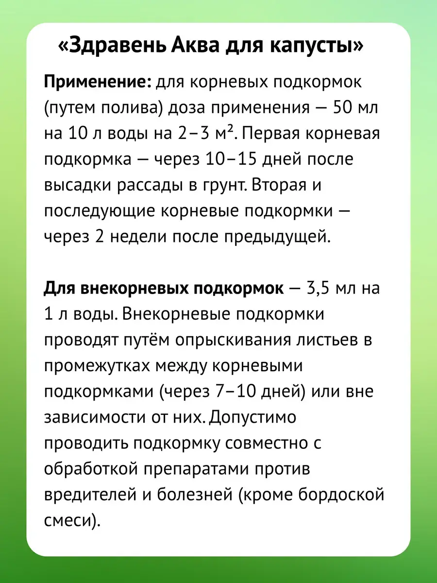 «Здравень аква » — жидкое комплексное органоминеральное удобрение для корневой и некорневой подкормки капусты в личных подсобных хозяйствах.
