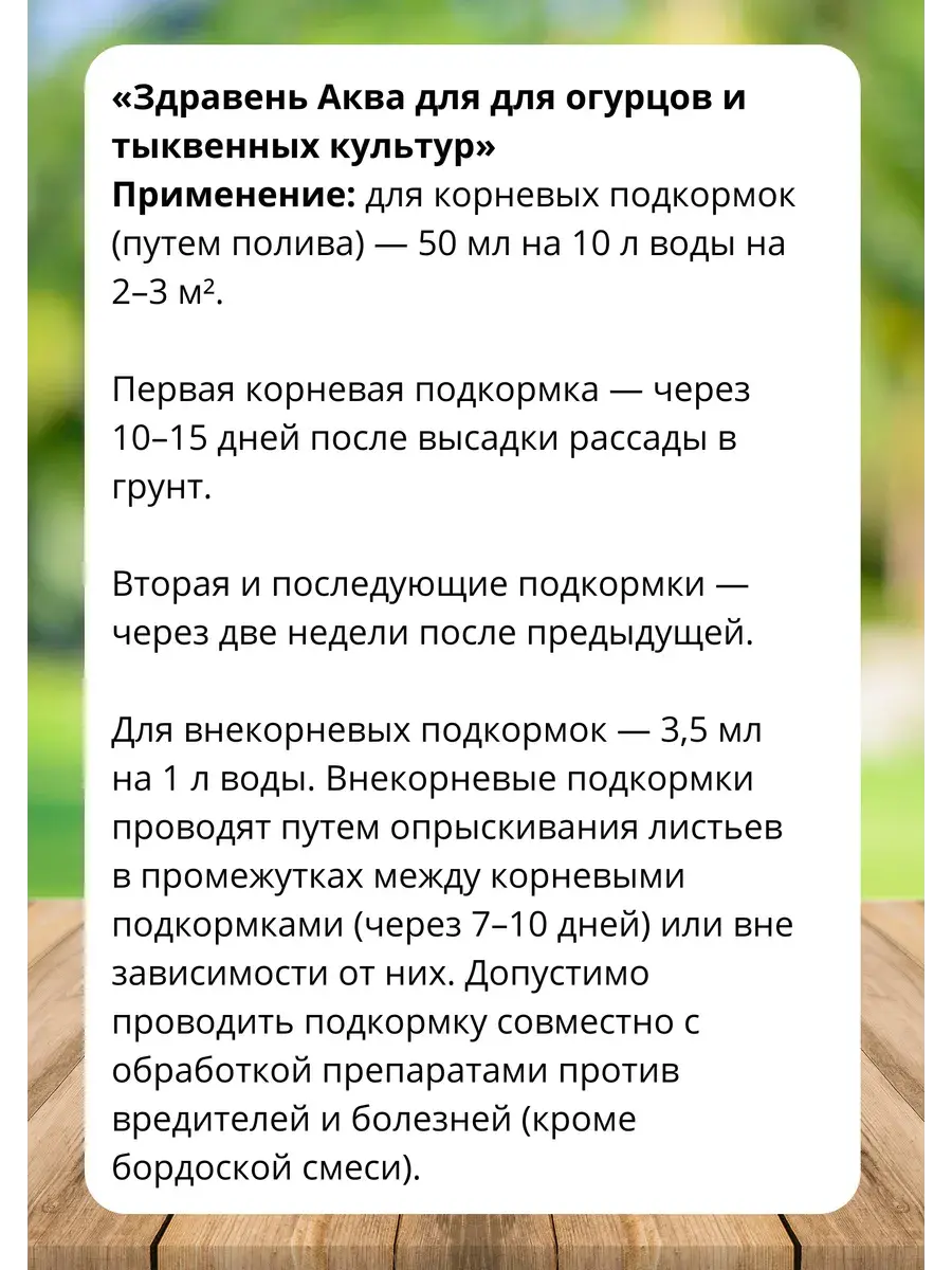 «Здравень аква» — жидкое комплексное органоминеральное удобрение для корневых и внекорневых подкормок огурцов, тыквенных и бахчевых культур в личных подсобных хозяйствах.