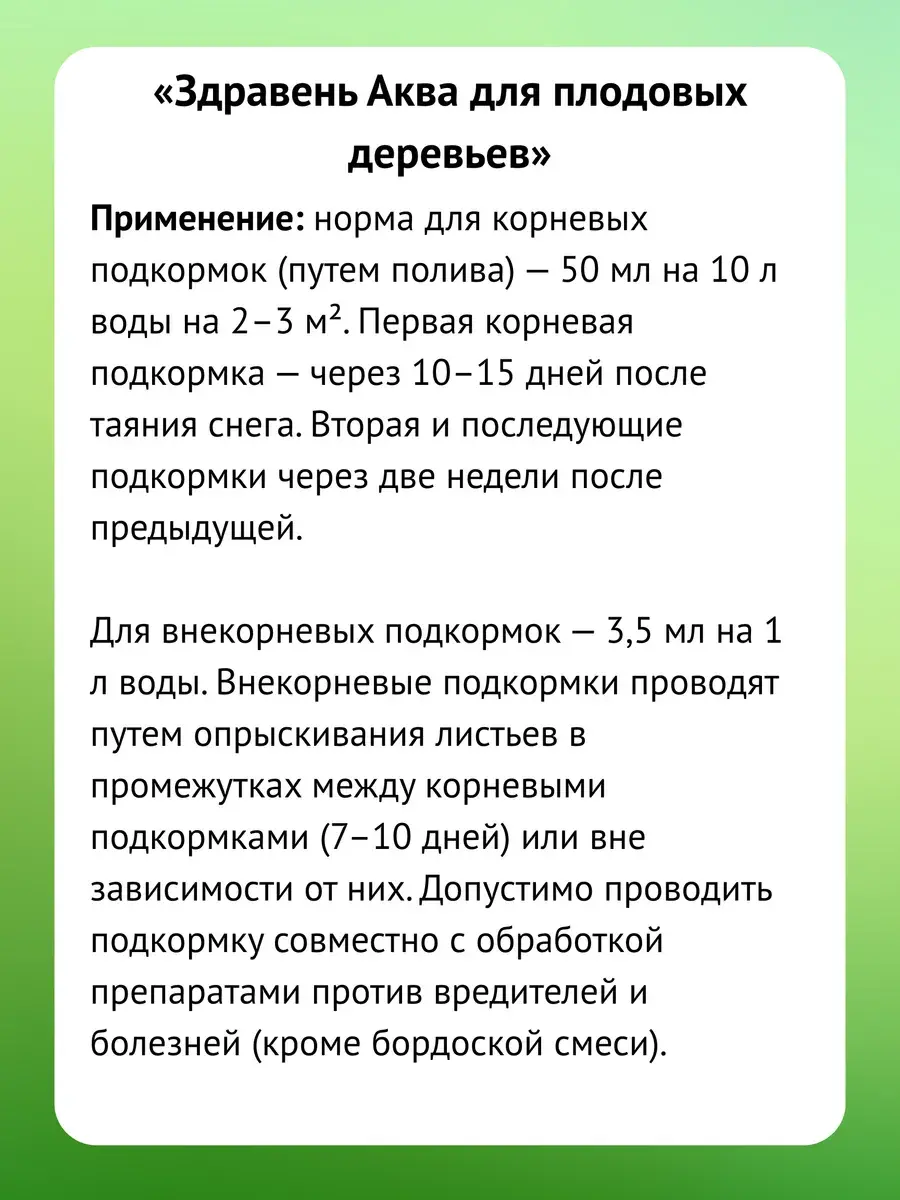 «Здравень Аква для плодовых деревьев» — жидкое комплексное органоминеральное удобрение для корневых и внекорневых подкормок плодовых деревьев (яблони, груши, сливы и др.) в личных подсобных хозяйствах.
