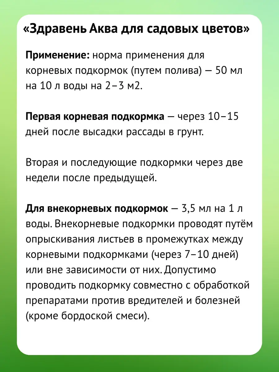 «Здравень аква» — жидкое комплексное органоминеральное удобрение для корневой и некорневой подкормки садовых цветов в личных подсобных хозяйствах. Содержит оптимальный для подкормки садовых цветов набор макро- и микроэлементов. Не содержит хлора.