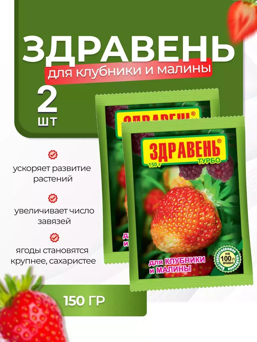 Здравень для Клубники и Малины 150 гр. Увеличивает число завязей и ягод, количество и площадь листьев. Ягоды становятся крупнее и сахаристее. Повышает устойчивость к болезням и неблагоприятным погодным условиям, а также зимостойкость растений. Ягоды созревают раньше, а ремонтантные сорта плодоносят обильнее и дольше. Состав: макроэлементы азот 12%, фосфор 12%, калий 29%, магний 1,5%, гумат натрия 2%; микроэлементы бор 0,03%, марганец 0,04%, цинк 0,02%, медь 0,02%, молибден 0,005%. Не содержит хлора! Применение: корневая подкормка — путем полива растений. Растворять удобрение лучше в теплой воде. Подкормки весной (до цветения) и в период плодоношения — 2–3 раза в месяц (15 г удобрения на 10 л воды на 1 погонный метр рядка). При подкормке до цветения к удобрению можно добавить карбамид — 5 г/10 л. После окончания сбора урожая подкормка — 15 г/10 л воды на 1 пог. м рядка. Можно добавить 5 г/10 л сернокислого калия. Внекорневая подкормка — путем опрыскивания. На 10 л воды — 10 г удобрения. Можно проводить каждые 2 недели. Допустимо совмещение с обработкой против вредителей и болезней. В чайной ложке с горкой 7–8 г, в столовой ложке с горкой 20–22 г, в спичечном коробке 18–19 г.