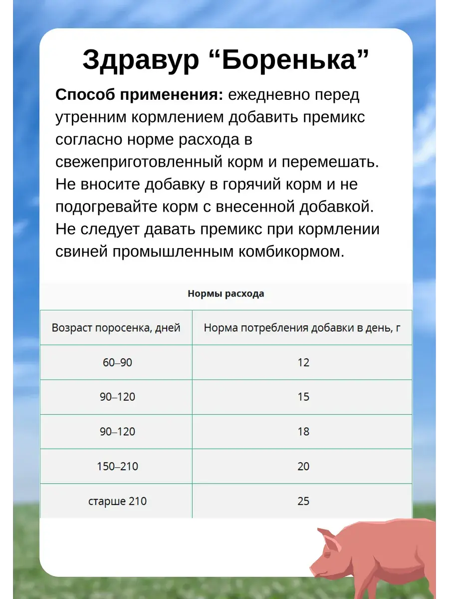 Премикс Здравур для поросят и свиней "Боренька", 2 уп. по 600г. (1,2 кг) Кормовая добавка Здравур "Боренька» обеспечивает организм поросят всеми необходимыми витаминами, микроэлементами, а также аминокислотами; улучшает обмен веществ, пищеварение, кроветворение. Поросята благодаря ей растут быстрее: привесы на 2–3 кг в месяц больше, чем без добавок. Повышается иммунитет животных, исключаются авитаминозы и паракератоз. У поросят улучшается аппетит, они становятся веселыми и бодрыми. Только добавки «Здравур» содержат кормовые ферменты, превращающие трудноперевариваемые питательные вещества в легкоусвояемую форму. Благодаря этому корма усваиваются лучше и расходуются экономнее. Поросята со «Здравуром Боренька» быстрее откармливаются, а мясо у них получается более вкусным. Эта добавка не содержит антибиотиков, гормонов, ГМО и других опасных для здоровья человека веществ. «Здравур Боренька» позволяет получить при выращивании каждого поросенка до 20 кг мяса сверх «плана»! Затраты на приобретение этой добавки окупаются десятикратно! Состав: 8 витаминов, 7 микроэлементов, специальный комплекс аминокислот и ферментов. Способ применения: ежедневно перед утренним кормлением добавить премикс, согласно норм расхода, в свежеприготовленный корм и перемешать. Нормы расхода: Возраст поросенка 60–90 дней, норма - 12 г/день; Возраст поросенка 90–120 дней, норма - 15 г/день; Возраст поросенка 120–150 дней, норма - 18 г/день; Возраст поросенка 150–210 дней, норма - 20 г/день; Возраст поросенка старше 210 дней, норма - 25 г/день;