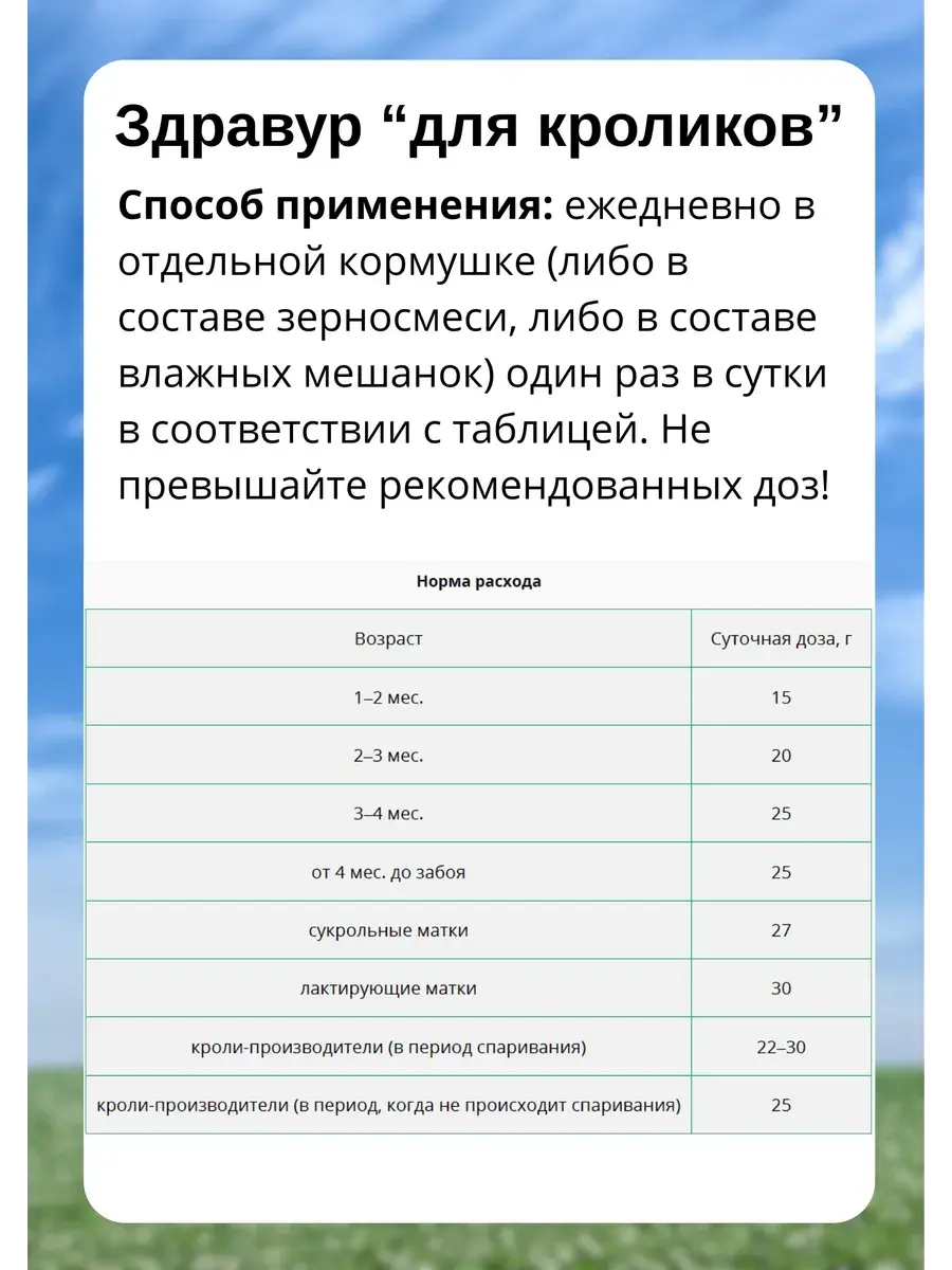 Здравур – специально разработанная кормовая добавка, созданная для обеспечения оптимального питания и здоровья кроликов. Каждая упаковка весом 900 грамм поможет вам обеспечить кроликам все необходимое для активного и здорового образа жизни.Состав "Здравура" богат белками, витаминами и минералами, которые сбалансированно сочетаются для поддержания здоровья и правильного развития кроликов. Он является незаменимым источником питательных веществ, способствует укреплению иммунной системы и повышению защитных функций организма. Он способствует улучшению пищеварения, усвоению питательных веществ и поддержанию нормальной физиологии кроликов.Упаковка весом 900 грамм обеспечивает удобство использования, точное дозирование. Ваше Хозяйство Здравур для кроликов 900гр. – сбалансированная витаминно-минеральная кормовая добавка для кроликов. Продукт укрепляет иммунитет, нормализует обмен веществ, снижает заболеваемость, улучшает состояние шерстяного покрова и качество шкурки, повышает аппетит. Благодаря добавке молодняк кроликов растет и развивается быстрее, животные на откорме дают более высокие привесы и выход мяса, от крольчих получают более жизнеспособных и крепких крольчат, повышается молочность маток. Не содержит антибиотиков, гормонов и стимуляторов роста. Хранить в сухом, защищенном от света помещении при температуре от 0°С до 25°С. Способ применения и дозы: Ежедневно в отдельной кормушке (либо в составе зерносмеси, либо в составе влажных мешанок) один раз в сутки в соответствии с нормой расхода. Норма расхода: возраст 1-2 мес – 15 г, 2-3 мес – 20 г, 3-4 мес – 25 г, от 4 мес – 25 г, сукрольные матки – 27 г, лактирующие матки – 30 г, кроли производители (в период спаривания) – 22-30 г, кроли производители (в период, когда не происходит спаривания) – 25 г.