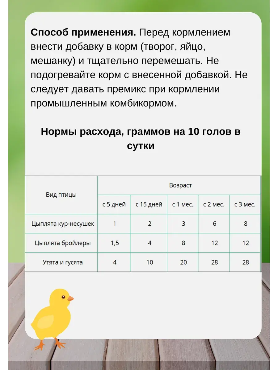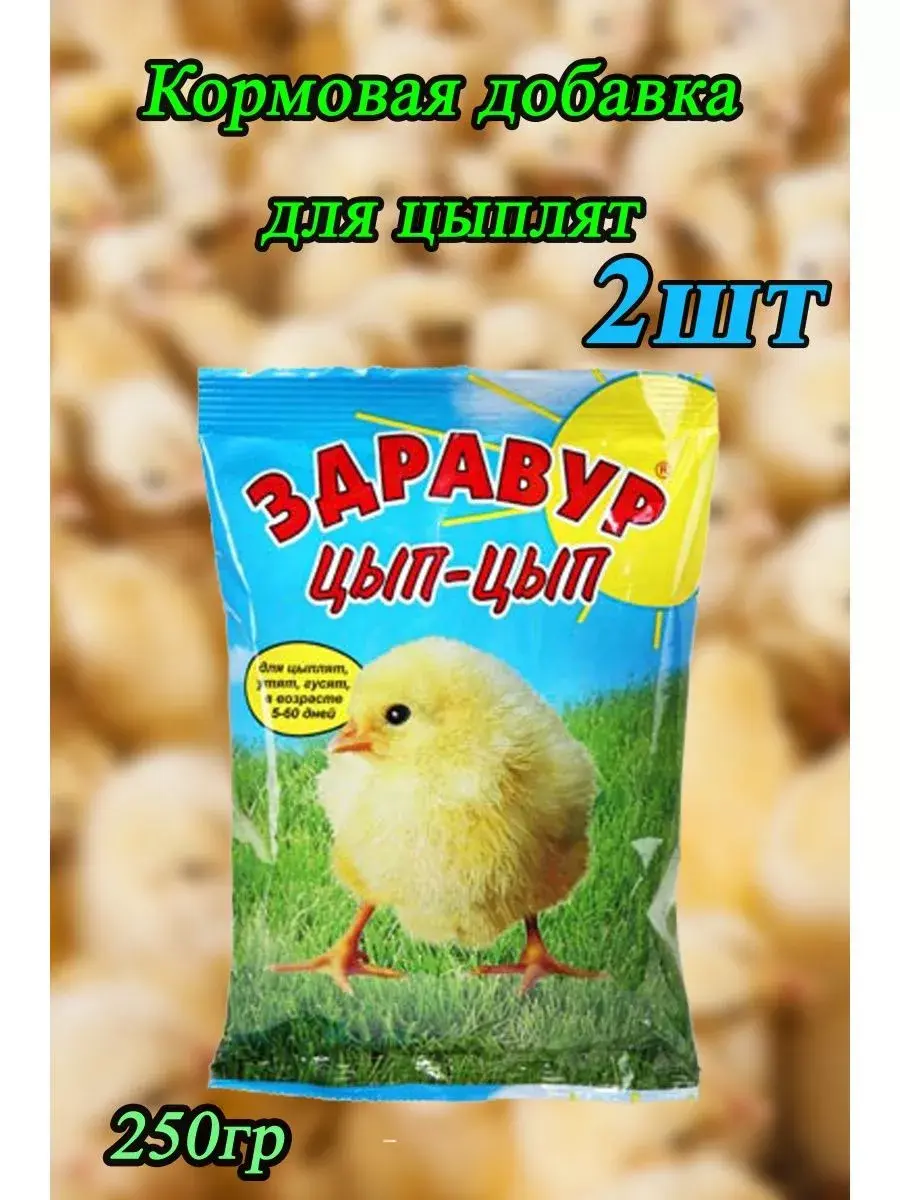 Кормовая добавка Здравур Цып-Цып 250г. для цыплят, утят и гусят в возрасте от 5 до 150 дней. При использовании премикса "Здравур Цып-цып" птенцы быстрее растут, меньше болеют, выглядят крепкими и веселыми. Из молодняка, ежедневно получающего добавку "Здравур Цып-цып", вырастают более крупные и здоровые птицы, курицы-молодки начинают раньше нестись, а в будущем от таких кур получают на 15% яиц больше, чем от остальных. Ежедневное применение премикса "Здравур Цып-цып": уменьшает отход молодняка в 2-3 раза; снижает заболеваемость в 5-6 раз; ускоряет рост птенцов на 20-25%; создает гарантию будущей высокой продуктивности птицы; предохраняет от рахита, искривления ног, нарушения обмена веществ и болезней глаз. Для цыплят, утят, гусят. Содержит 14 витаминов, 7 микроэлементов, аминокислоты, ферменты Идеально подходит для птенцов и молодняка в период роста и развития.