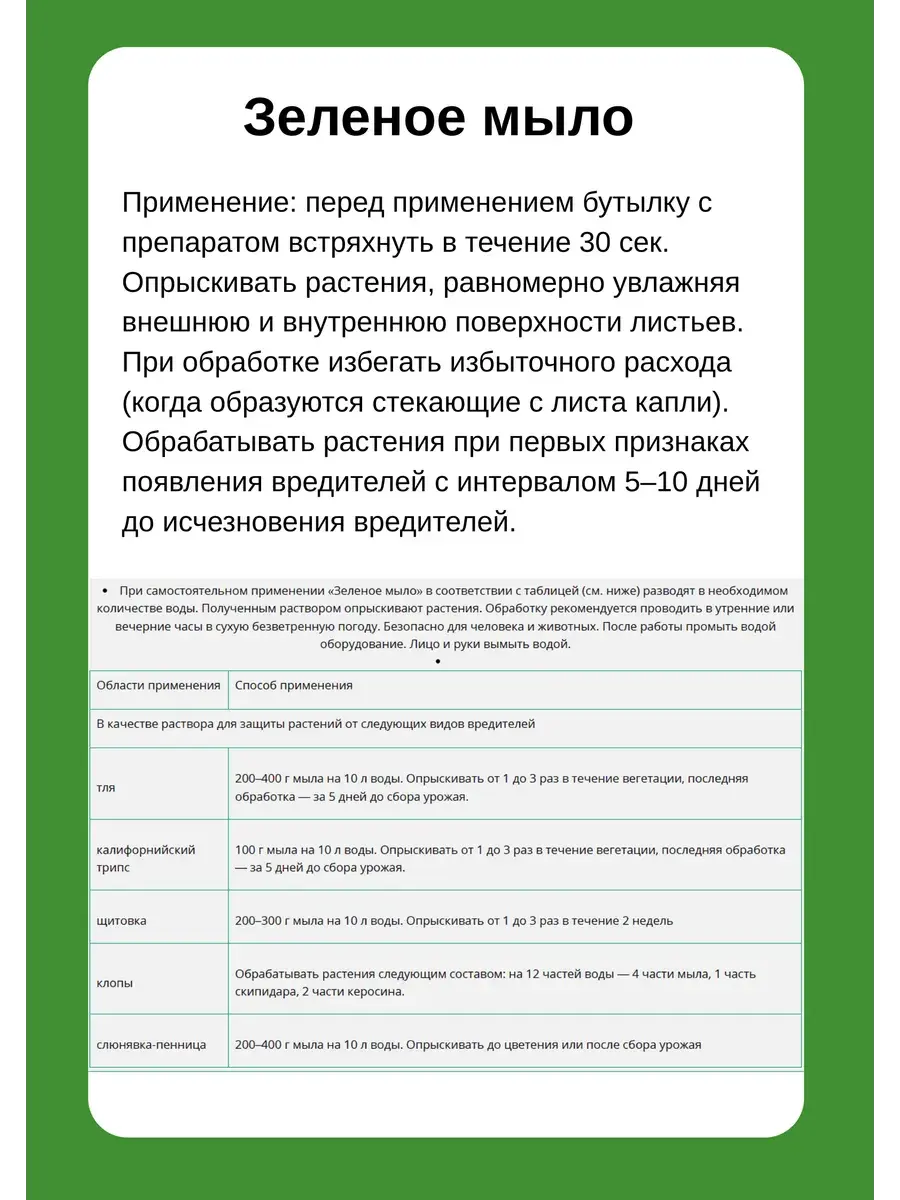Зеленое мыло - это натуральное средство для защиты растений от вредителей и болезней, которое имеет множество преимуществ перед химическими инсектицидами и фунгицидами. В отличие от химических препаратов, Зеленое мыло не содержит токсичных веществ, которые могут нанести вред окружающей среде и человеку. Это экологически безопасное средство, которое не только помогает бороться с вредителями и болезнями на растениях, но и улучшает их здоровье и рост. Состав средства Ваше хозяйство от болезней растений с калийными солями жирных кислот предотвращает поражение садово-огородных и декоративных культур тлей, клопами, трипсами, щитовкой и прочими насекомыми. Препарат для защиты от вредителей можно сочетать с пестицидами или использовать самостоятельно. Зеленое мыло используется для обработки растений в качестве натурального инсектицида. Помогает укрепить иммунитет растений и повысить их устойчивость к вредителям и болезням. Зеленое мыло также может использоваться как удобрение для растений. Оно содержит микроэлементы и питательные вещества, которые помогают улучшить здоровье растений и повысить их урожайность. Способствует развитию полезных микроорганизмов в почве, что улучшает ее структуру и плодородие. Срок годности: 36 месяцев. Используйте Зеленое мыло для борьбы с вредителями и болезнями на ваших растениях. Этот натуральный препарат поможет вам защитить свой урожай и сохранить здоровье ваших растений без использования химических инсектицидов и фунгицидов. Кроме того, Зеленое мыло поможет улучшить здоровье и рост ваших растений, что повысит их урожайность и качество.