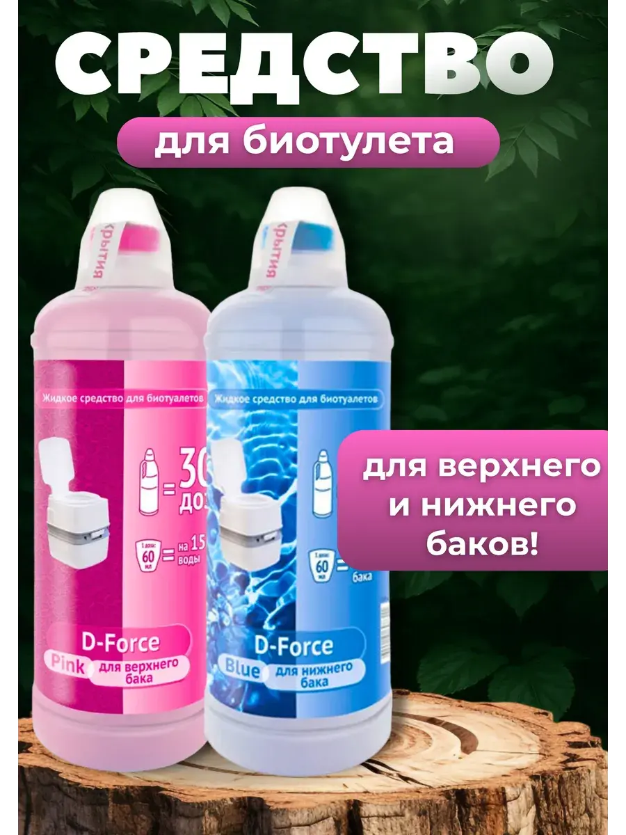 Набор средств для биотуалетов. В набор входит средство для нижнего и верхнего баков . Эффективное сочетание препаратов для очищения баков биотуалетов. Ароматизирующее средство D-Force Pink комфорт устраняет неприятные запахи и облегчает смыв в биотуалете. Сохраняет воду в баке свежей, нейтрализует неприятные запахи, оставляет приятный аромат после каждого смыва. Благодаря особой формуле жидкость образует на туалетной чаше защитную пленку, которая облегчает смыв, предотвращает появление темных пятен и дезинфицирует поверхность туалета. Средство для нижнего бака предотвращает газообразование, развитие гнилостных процессов, нейтрализует неприятные запахи, обладает дезодорирующим эффектом. Благодаря эффективному растворению твердых отходов внутренние стенки бака остаются чистыми. Не вызывает коррозии и старения пластмасс, металлов, резины, очищает внутренние стенки бака. Преимущества: Облегчает смыв. Состав жидкости для биотуалета нейтрализует неприятный запах, дезодорирует. Применение средства для верхнего бака предотвращает появление темных пятен на поверхности унитаза. Очищает и дезинфицирует туалетные поверхности. Предотвращает газообразование. Предотвращает «цветение» воды и сокращает расход воды при смыве. Средство экологически безопасно, не содержит токсических веществ. Рекомендуется использовать с D-Force Blue или Green для нижнего бака. Применение: добавьте в верхний бак биотуалета жидкость из расчета 60 мл средства D-Force Pink для верхнего бака на 15 литров воды. Затем добавьте в бак воду. Состав: вода ПАВ стабилизатор рН отдушка краситель. Срок годности: 3 года. Жидкость для верхнего бака биотуалета, дезодорирующее средство для устранения неприятных запахов и против цветения воды, разложения и устранения отходов, растворения туалетной бумаги и жира. Экологически чистое дезинфицирующее средство для ухода за биотуалетом и нейтрализации запахов.