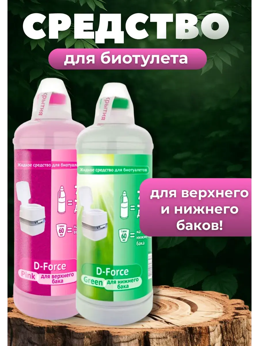 Набор жидкое средство для биотуалетов 1,8л+1,8л для верхнего бака и жидкое средство для биотуалетов для нижнего бака. Отличное сочетание препаратов для эффективного очищения верхнего и нижнего баков биотуалетов. Ароматизирующее средство D-Force Pink комфорт устраняет неприятные запахи и облегчает смыв в биотуалете. Сохраняет воду в баке свежей, нейтрализует неприятные запахи, оставляет приятный аромат лаванды после каждого смыва. Благодаря особой формуле жидкость образует на туалетной чаше защитную пленку, которая облегчает смыв, предотвращает появление темных пятен и дезинфицирует поверхность туалета. Средство для нижнего бака предотвращает газообразование, развитие гнилостных процессов, нейтрализует неприятные запахи, обладает дезодорирующим эффектом. Благодаря эффективному растворению твердых отходов внутренние стенки бака остаются чистыми. Не вызывает коррозии и старения пластмасс, металлов, резины, очищает внутренние стенки бака.
