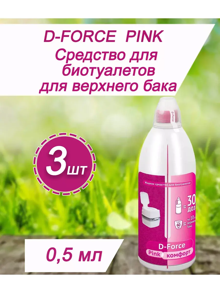Жидкое средство для биотуалетов D-Force Pink 0,5 л ароматизирующее средство D-Force Pink комфорт устраняет неприятные запахи и облегчает смыв в биотуалете. Жидкость для ухода за верхним баком биотуалета. Жидкость для туалета сохраняет воду в баке свежей и нейтрализует неприятные запахи, оставляет приятный аромат лаванды после каждого смыва. Благодаря особой формуле жидкость образует на туалетной чаше защитную пленку, которая облегчает смыв, предотвращает появление темных пятен и дезинфицирует поверхность туалета. Ароматическая композиция — лаванда. Преимущества: Облегчает смыв. Состав жидкости для биотуалета нейтрализует неприятный запах, дезодорирует. Примение средства для верхнего бака предотвращает появление темных пятен на поверхности унитаза. Средство для биотуалета очищает и дезинфицирует туалетные поверхности. Для биотуалета жидкость предотвращает газообразование. Предотвращает «цветение» воды и сокращает расход воды при смыве. Средство экологически безопасно, не содержит токсических веществ. Как жидкость для биотуалета набор рекомендуется использовать жидкость для биотуалета нижний бачок с D-Force Blue или Green. Применение: добавьте в верхний бак биотуалета жидкость из расчета 60 мл средства D-Force Pink для верхнего бака на 15 литров воды. Затем добавьте в бак воду. Состав: вода ПАВ стабилизатор рН отдушка краситель. Срок годности: 3 года.Жидкость для верхнего бака биотуалета, дезодорирующее средство для биотуалета от запаха и против цветения воды, разложения и устранения отходов, растворения туалетной бумаги и жира. Используется в биотуалет для дома и биотуалет для дачи. Экологически чистое дезинфицирующее средство для ухода за биотуалетом и нейтрализации запахов.
